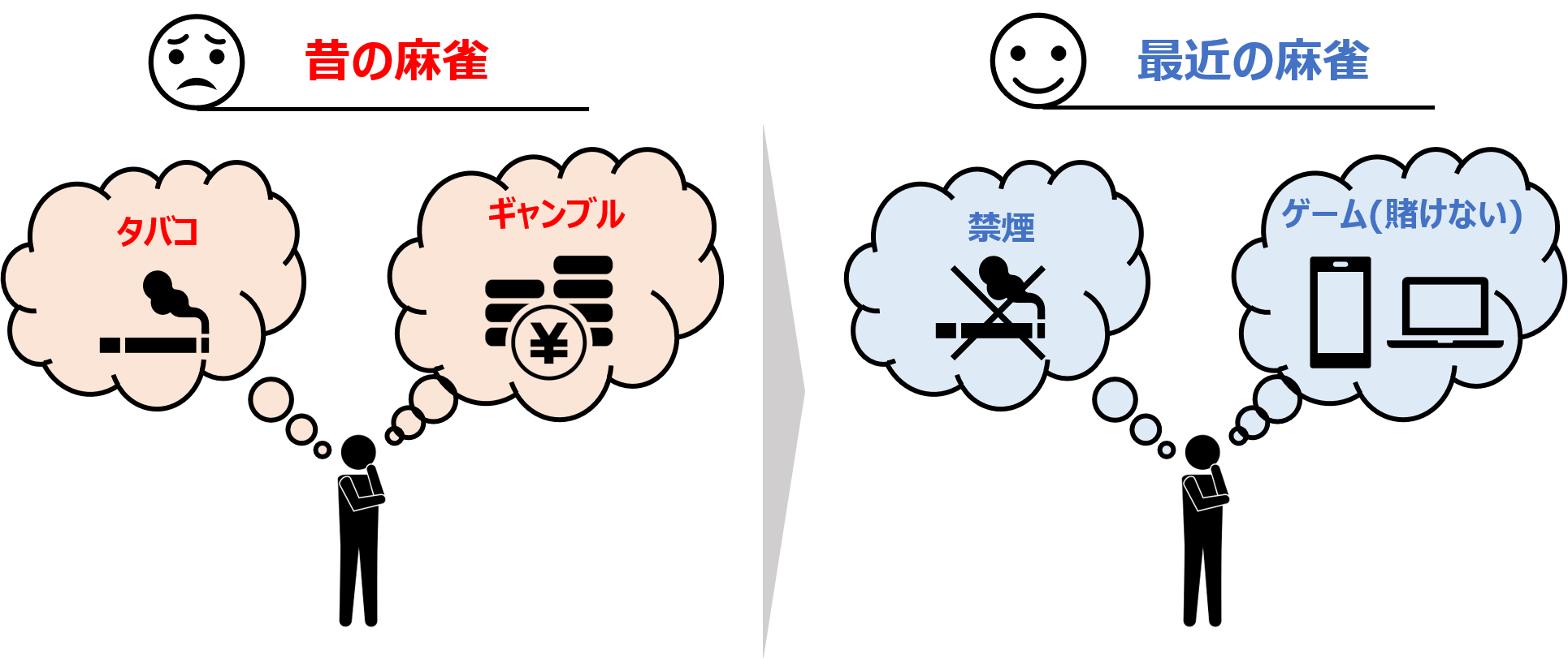 最近では、賭けを一切行わない「ノーレート(賭けない)麻雀」やタバコを禁止とする「禁煙麻雀」、高齢者の頭の体操を目的とした「健康麻雀」が注目を浴びていて、麻雀を娯楽として楽しむ方々が増えてます。