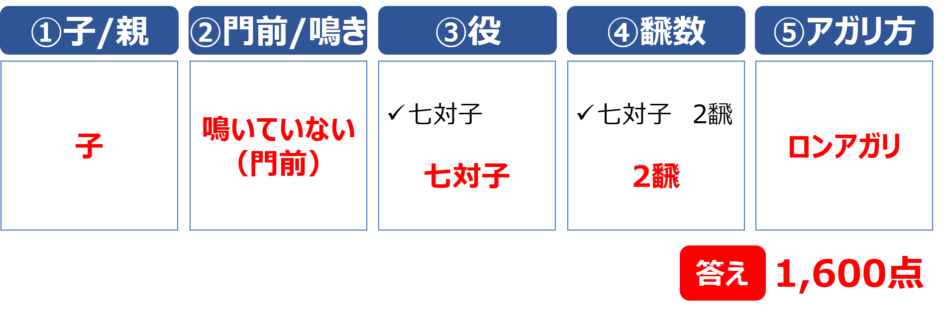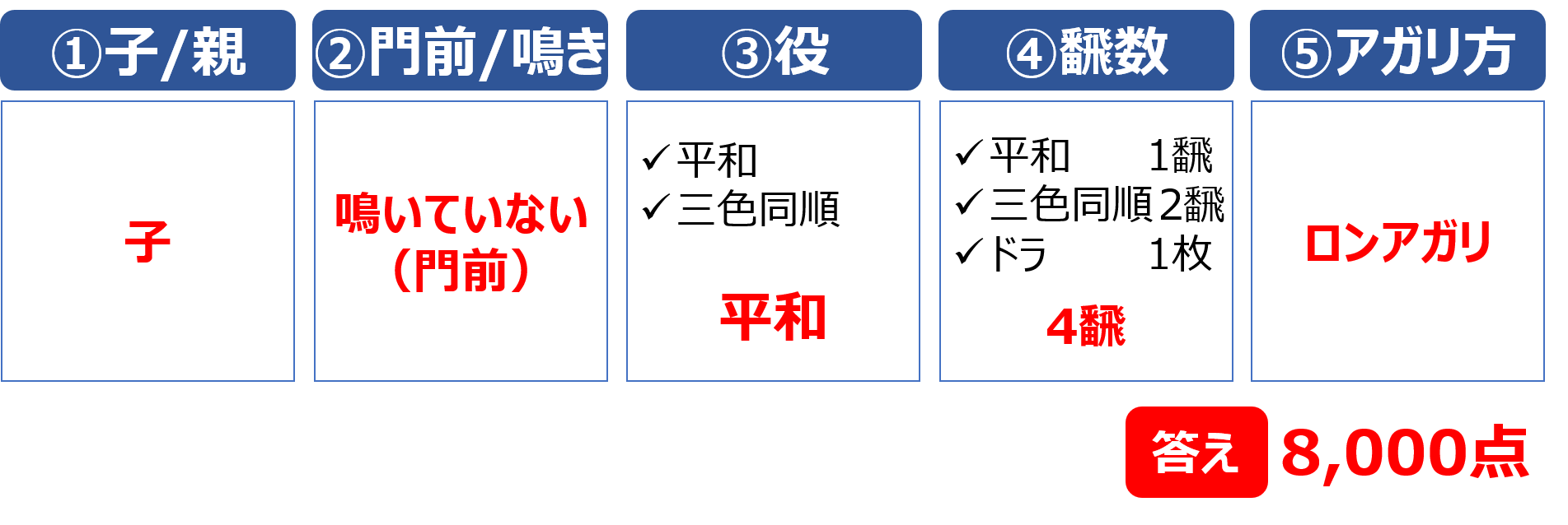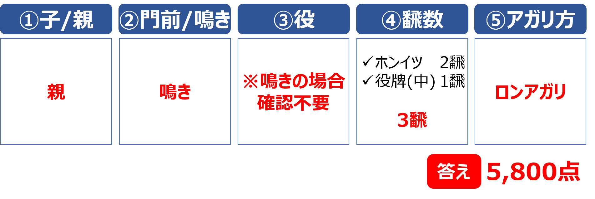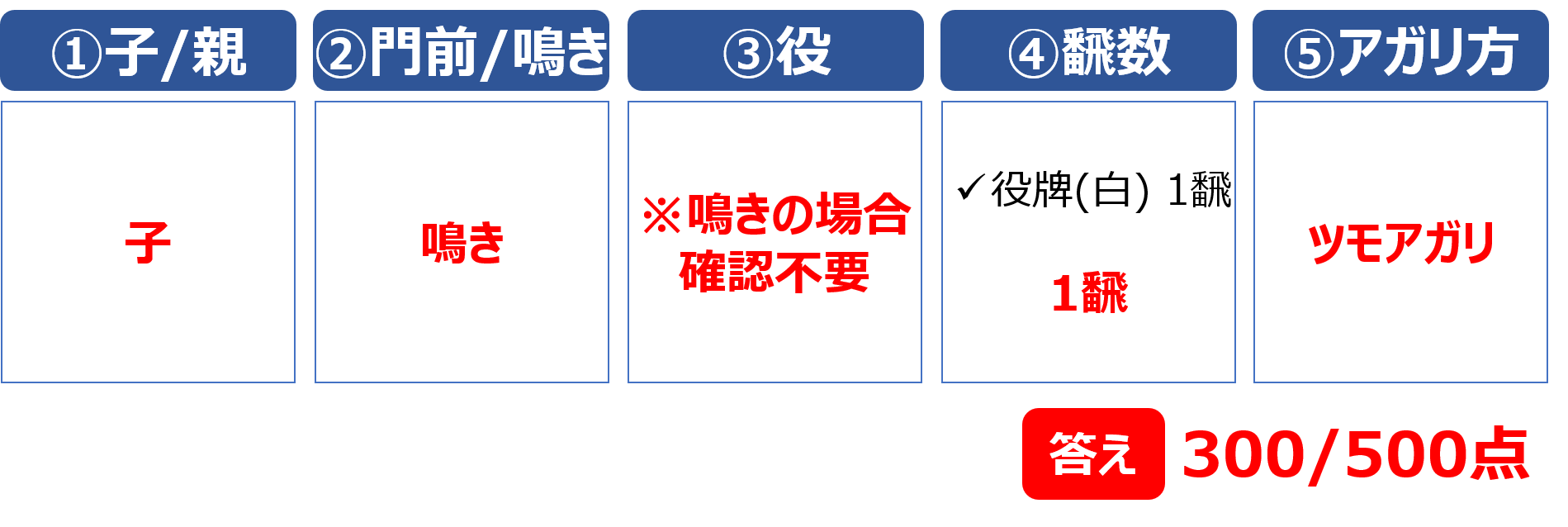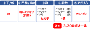 鳴いている場合は、初心者向けの点数表の「鳴いている」の欄を確認します。