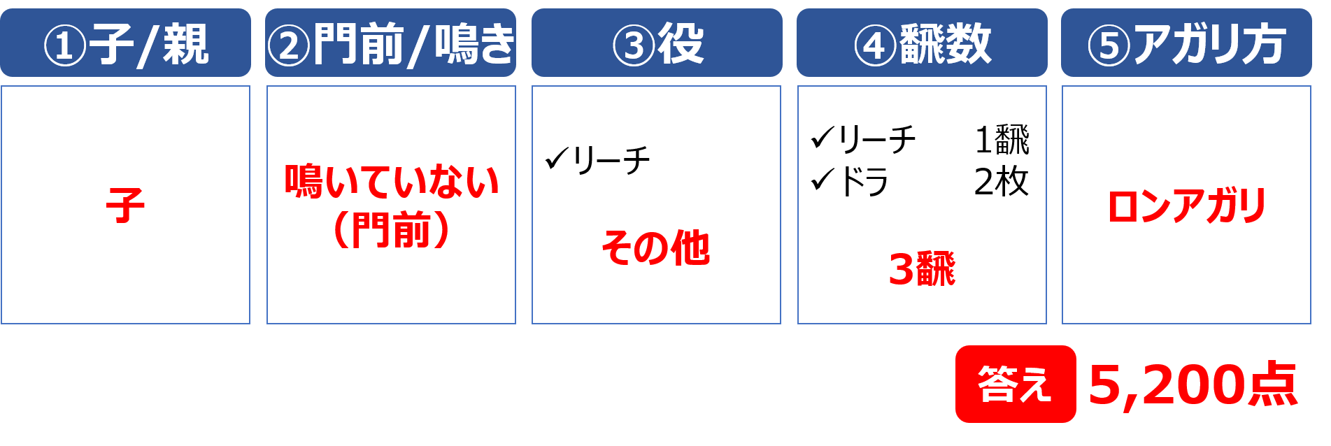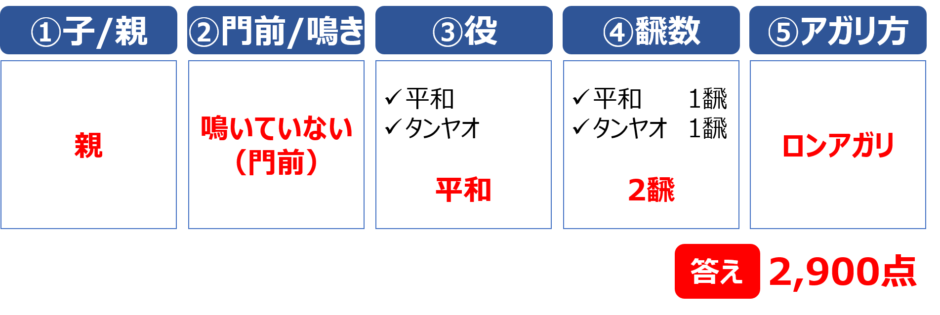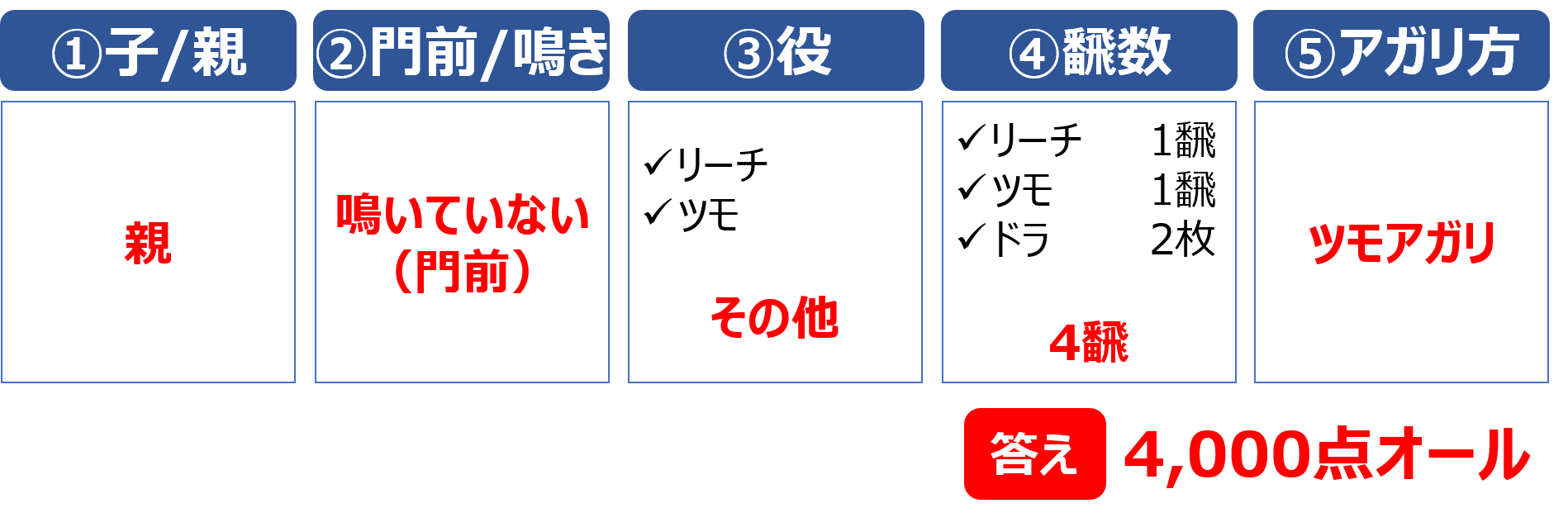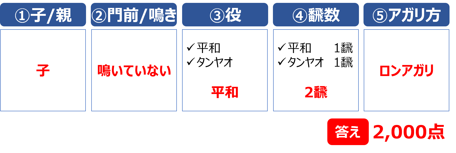 鳴いている場合は、初心者向けの点数表の「鳴いている」の欄を確認します。