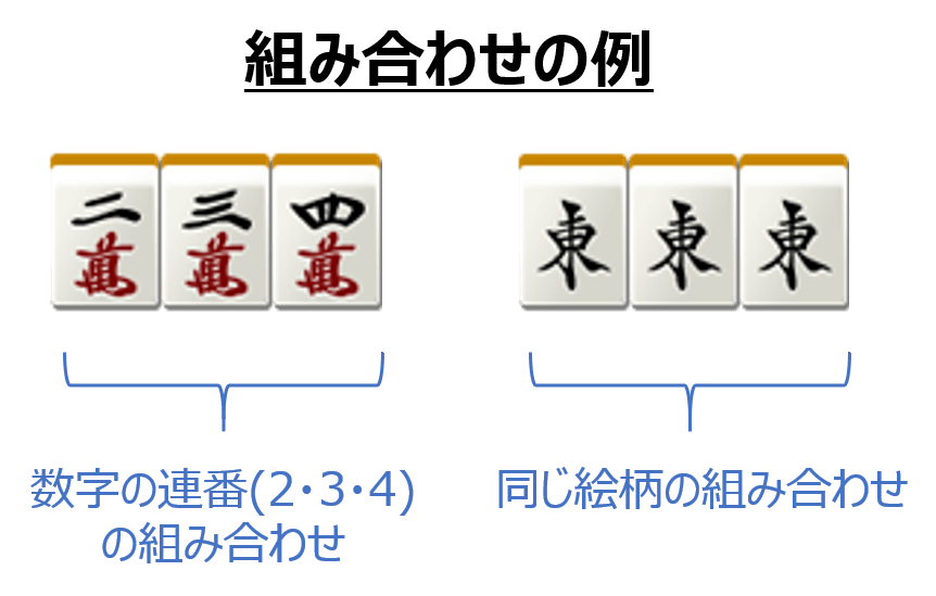 麻雀牌はパズルピースですので以下のように組み合わせることができ、このような組み合わせをいくつか完成させるとパズルの完成となります。